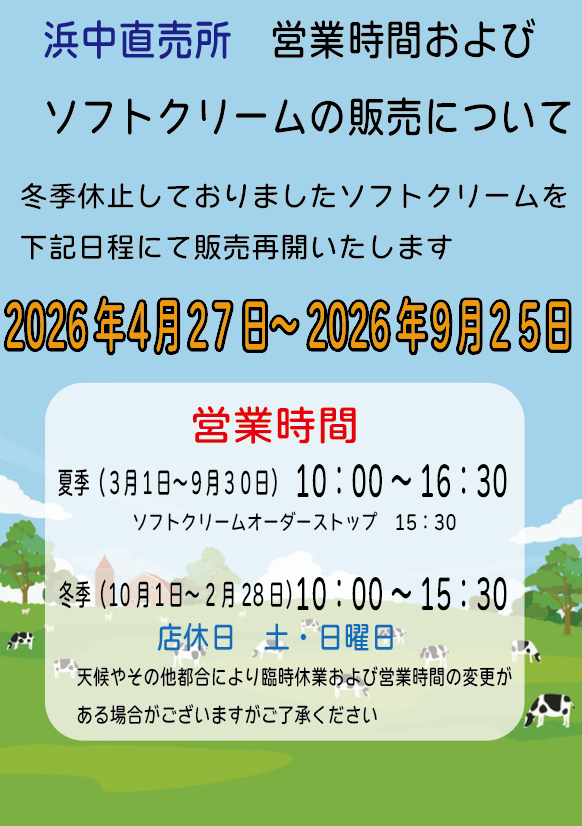 冬季休止しておりましたソフトクリームの販売につきまして下記の通り再開予定となりましたのでご案内申し上げます。