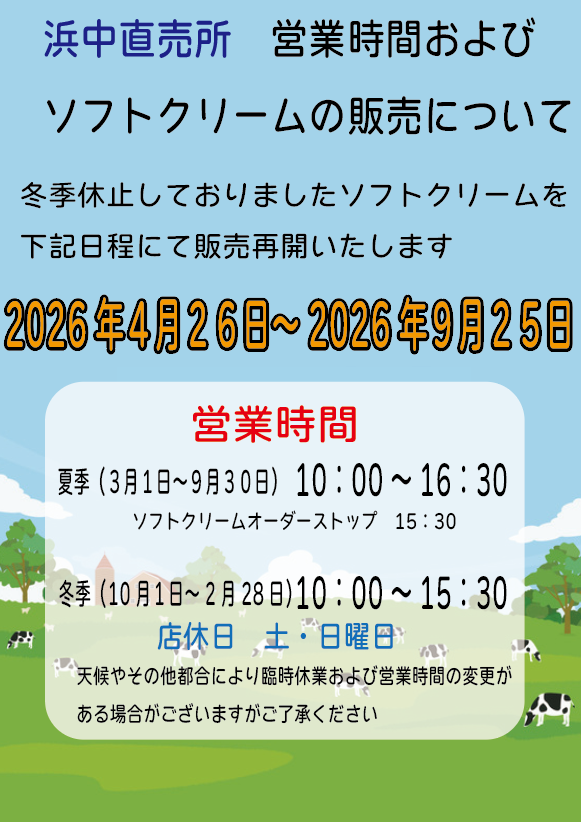 冬季休止しておりましたソフトクリームの販売につきまして下記の通り再開予定となりましたのでご案内申し上げます。